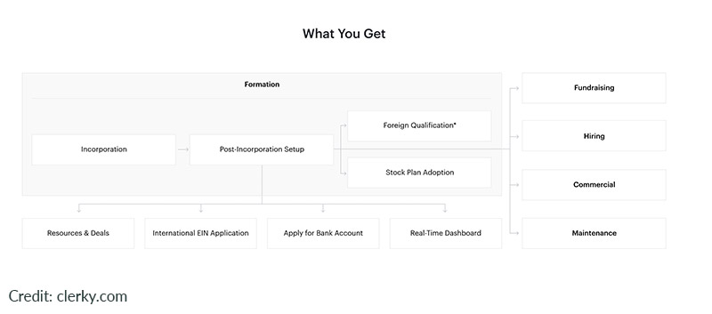 Clerky is a startup-focused formation service offering incorporation and post-incorporation services. Built to grow with a startup, Clerky provides a litany of services for fundraising, hiring, stock issuance, and more beyond the incorporation stage.