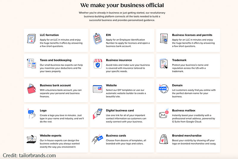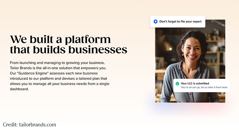 Tailor Brands describes itself as a “revolutionary business-building platform.” It’s known for having one of the best logo makers available, and its premium formation package includes powerful AI-driven tools for graphic design and marketing.